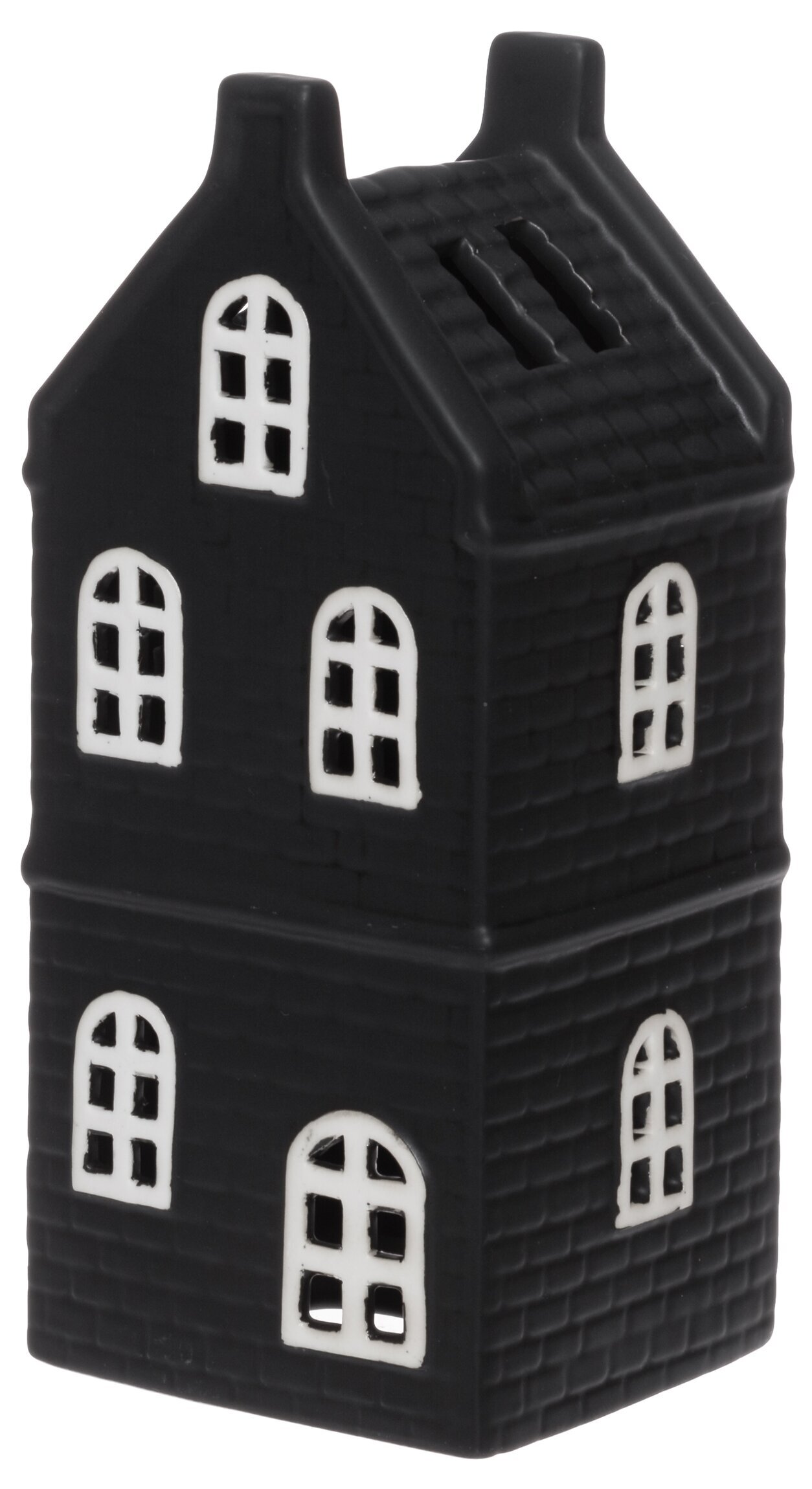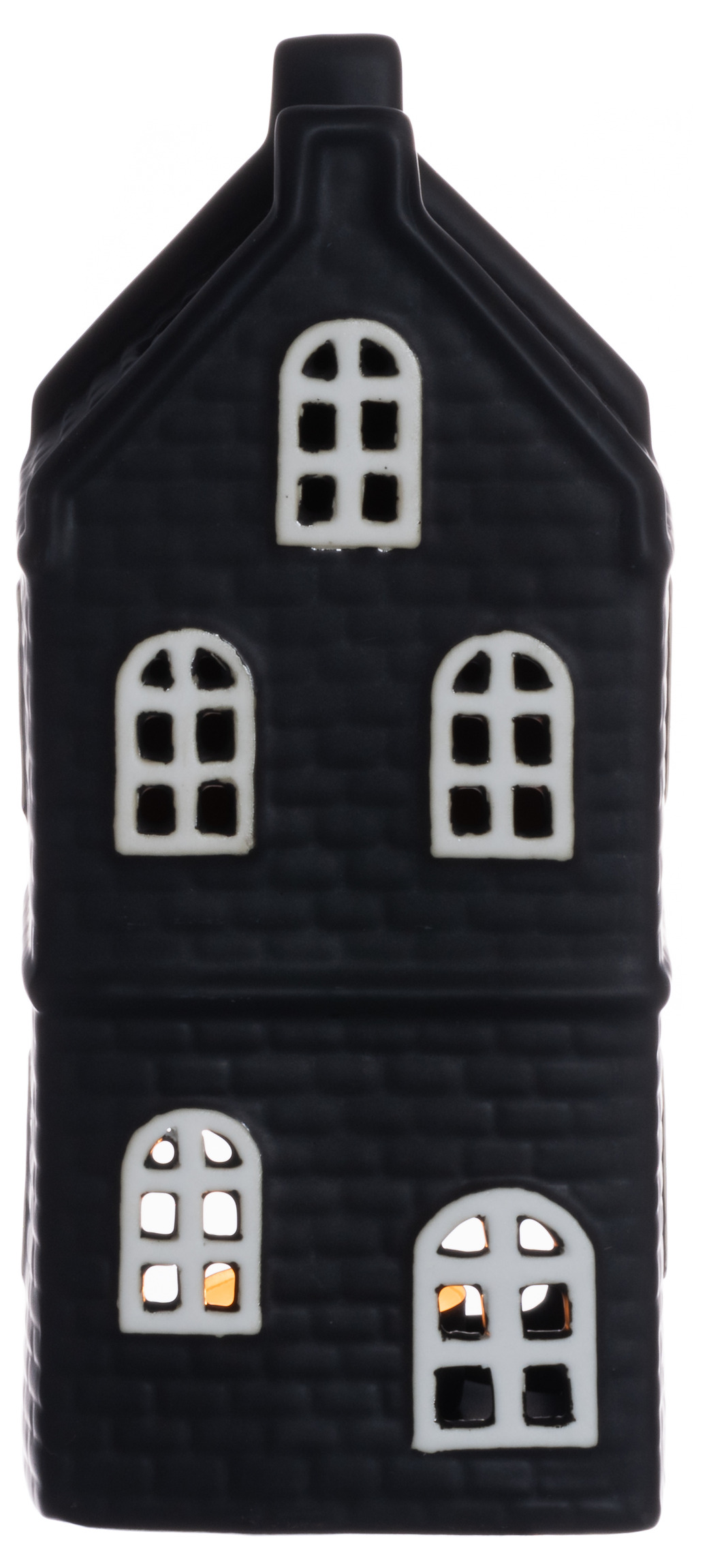 Ge ditt hem en modern och stämningsfull touch med denna svarta huslykta i porslin. Ljuset sprider sig mjukt genom de vita fönstren och skapar en vacker kontrast mot den mörka fasaden. Den eleganta designen gör att lyktan passar lika bra i en stilren inredning som i en mer klassisk julmiljö.