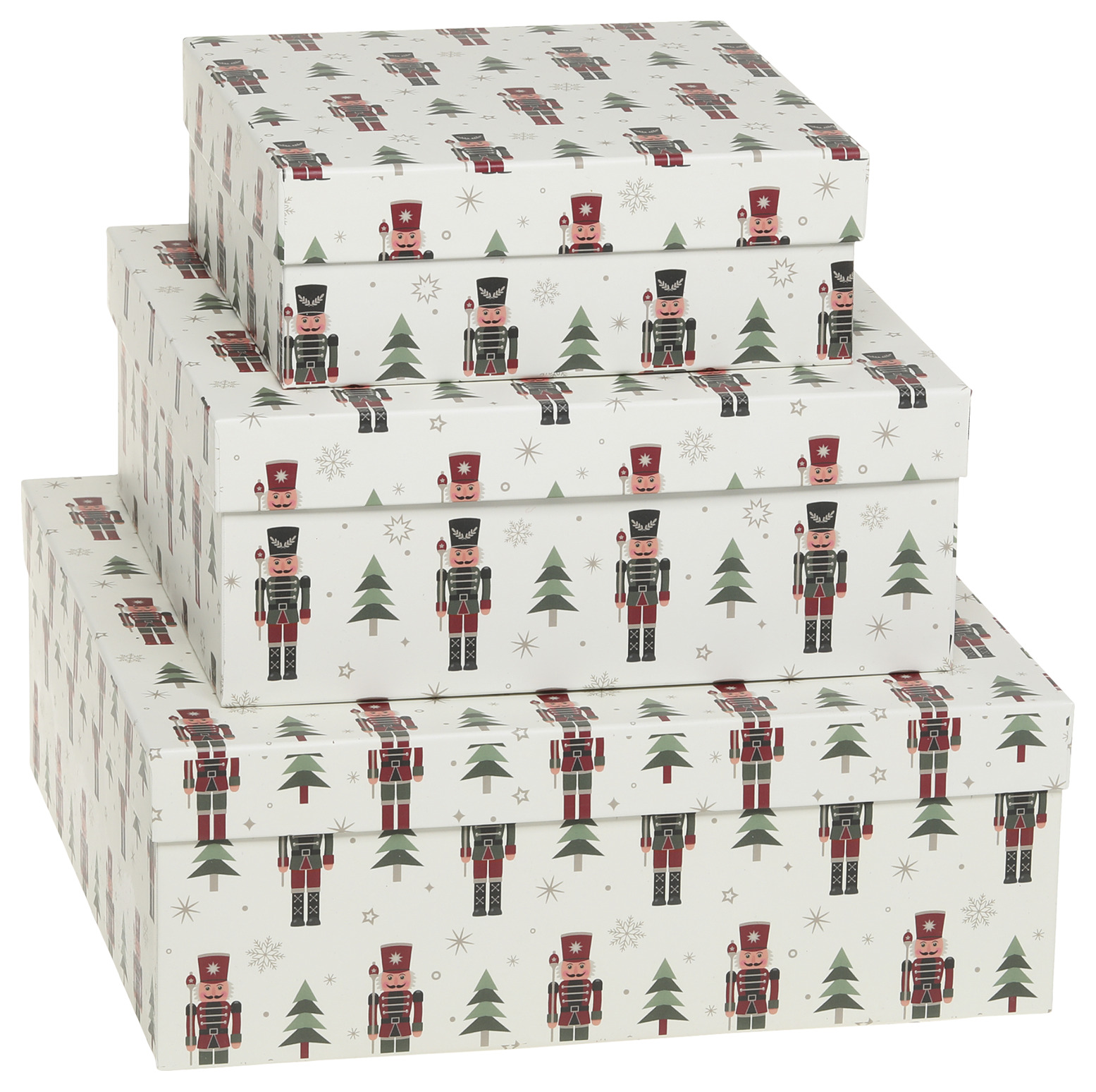 Praktiska och dekorativa boxar i tre olika storlekar, klädda i juligt mönster med nötknäppare, granar och snöflingor. Perfekta för att förvara julpynt, paketinslagning eller som vackra presentlådor under granen.