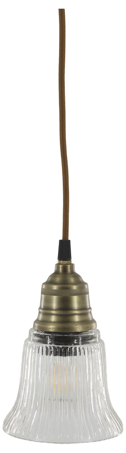 En vacker takpendel som kombinerar klassiskt formspråk med en rustik känsla. Lampskärmen i glas sprider ett mjukt, behagligt ljus och framhäver rummets atmosfär, medan detaljerna i mässing ger en elegant och gedigen känsla.