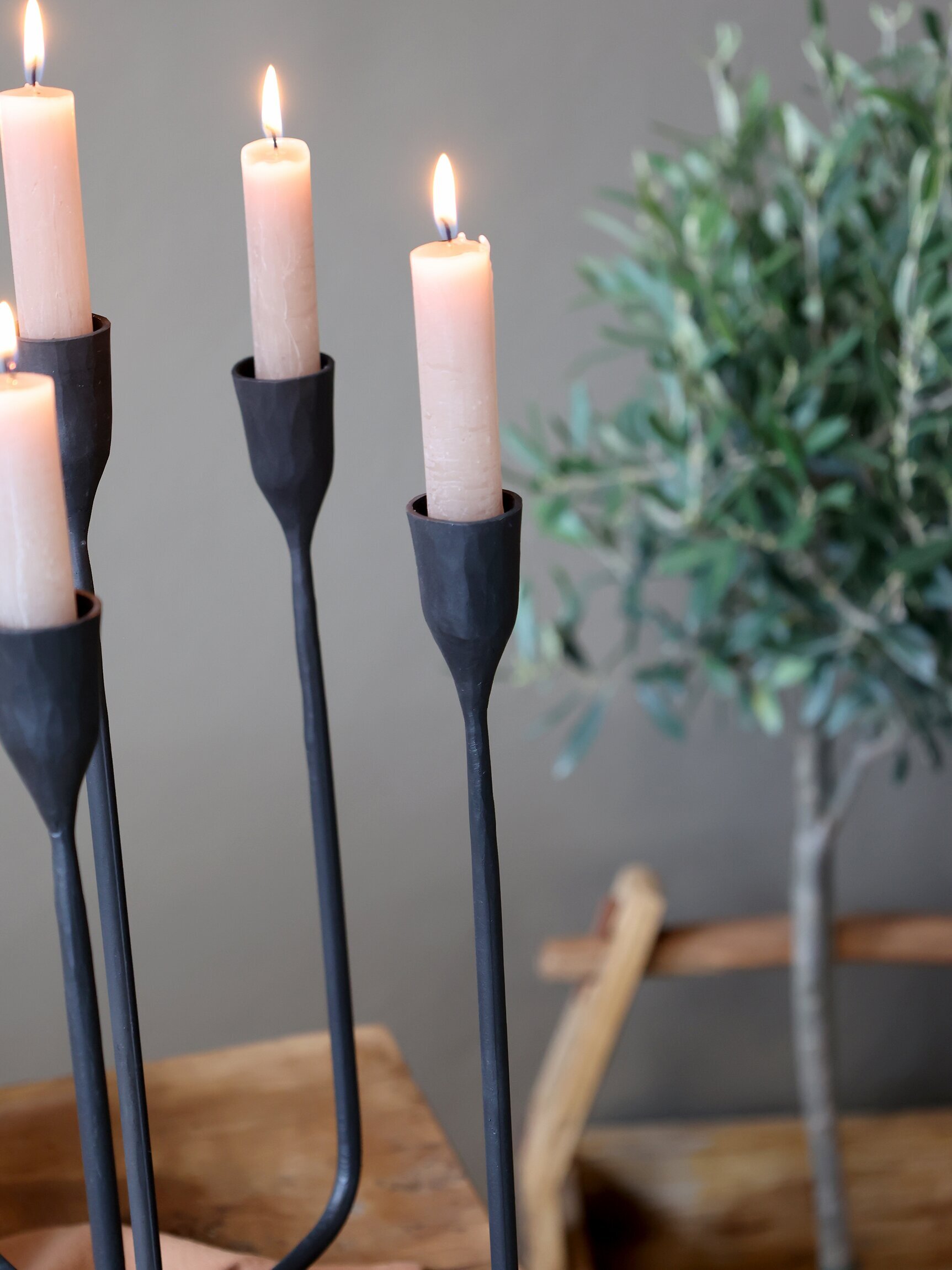 Ge ditt hem en varm och inbjudande känsla med denna vackra ljusstake i svart smide. Den har plats för sex ljus och blir en naturlig samlingspunkt på matbordet, i vardagsrummet eller på sideboardet. Den stilrena designen kombinerar klassisk elegans med rustik charm och passar lika bra till vardags som till festliga middagar.