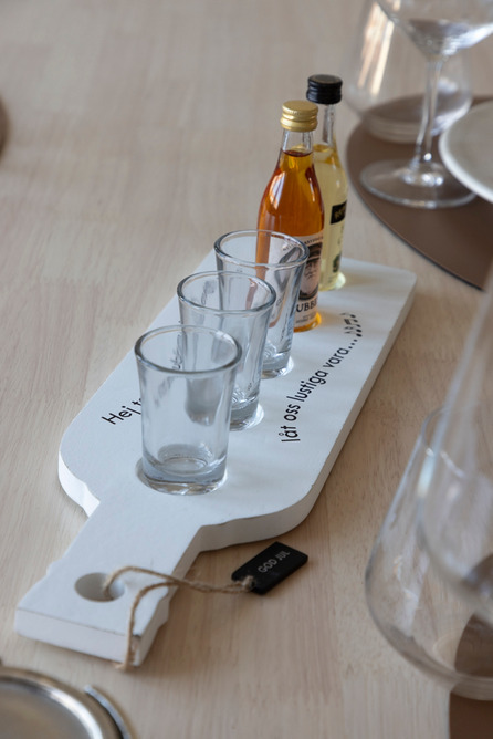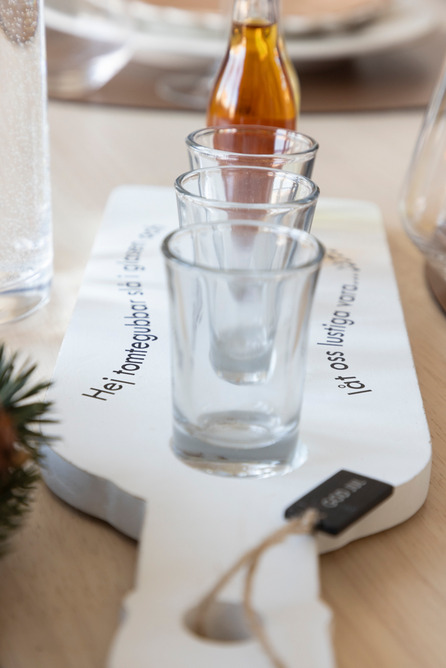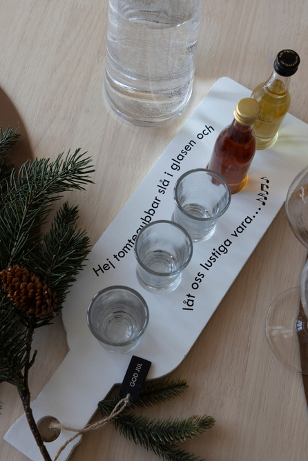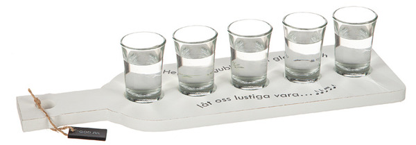 Brickan rymmer fem snapsglas (glas ingår, dryck ingår ej) och blir ett lekfullt och stilrent inslag på julbordet eller vid andra festliga tillfällen. Perfekt för att skapa stämning och bjuda på snaps med glimten i ögat.