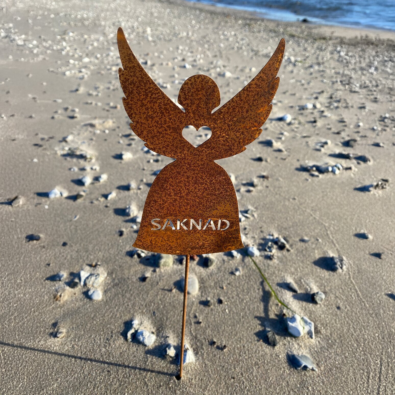 En vacker och stillsam ängel i rostig metall, med utskuret hjärta och texten Saknad. Passar fint som dekoration vid gravplats eller minnesplats, där den står som en symbol för kärlek och saknad.