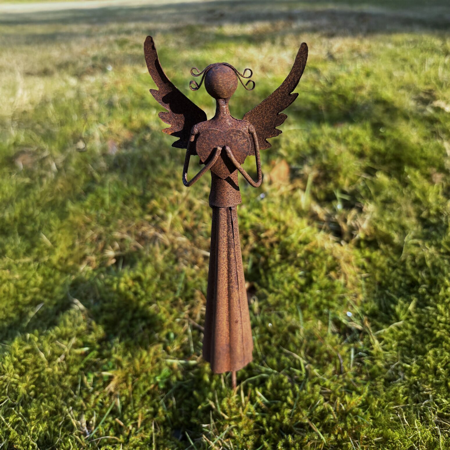 En vacker ängel i rostig metall som sprider frid och värme. Passar lika fint i en kruka på altanen som vid en grav eller minnesplats.