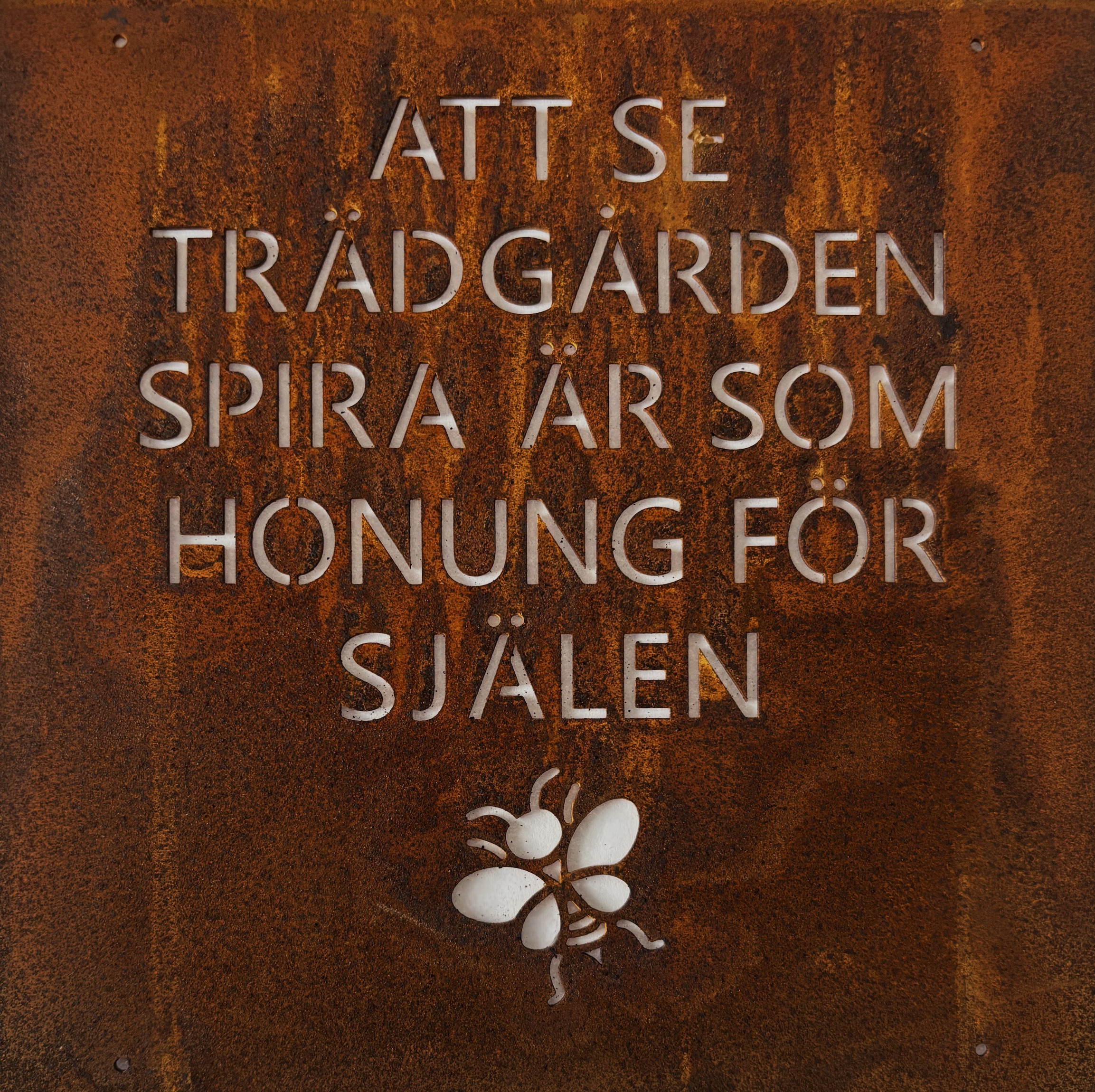 Dekorativ skylt i rostfinish som kan placeras med medföljande ståltråd på bl a armeringsnät. En fin detalj i trädgården. Passar till armeringsjärn storlek 15 x 15 cm.