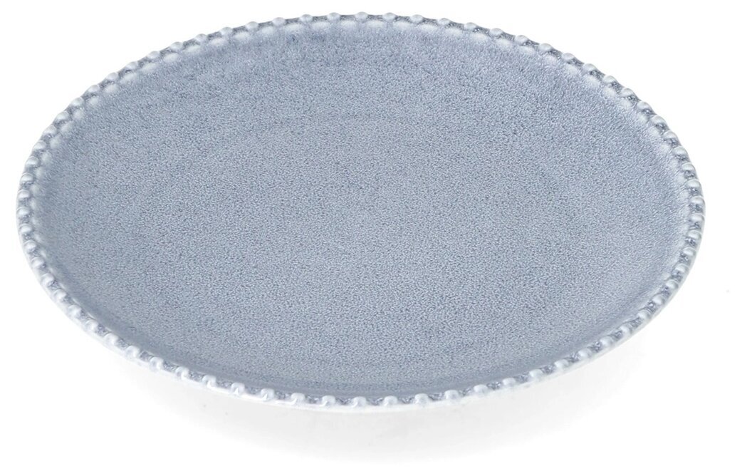 En vacker assiett i mjuk blå ton med dekorativ pärlkant – perfekt för både vardag och fest. Den glaserade ytan ger en stilren känsla medan den unika kanten adderar det lilla extra till dukningen.