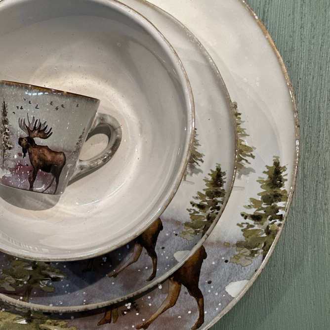 Skapa en stämningsfull dukning med denna vackra tallrik i stengods, dekorerad med ett handmålat vintermotiv av granar och en ståtlig älg. Perfekt till julbordet, vintermiddagar eller som en fin present. Den mjuka färgskalan och den rustika känslan gör att tallriken passar lika bra till vardag som till fest.