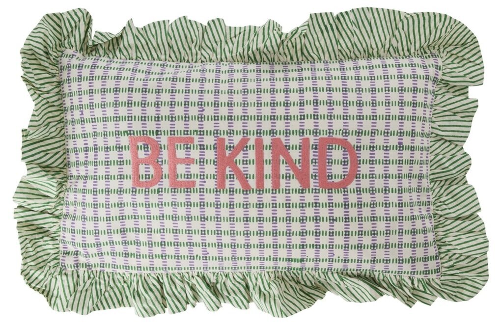 En lekfull och charmig kudde med budskapet Be Kind broderat i rosa på mönstrad botten. Med sin gröna volangkant blir den en härlig detalj som sprider både färg och värme i rummet. Perfekt för soffan, fåtöljen eller sängen – och en påminnelse om att vänlighet alltid gör skillnad.