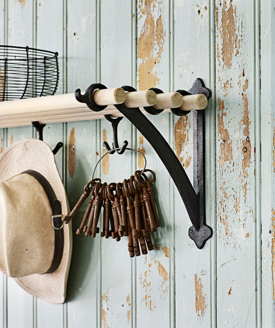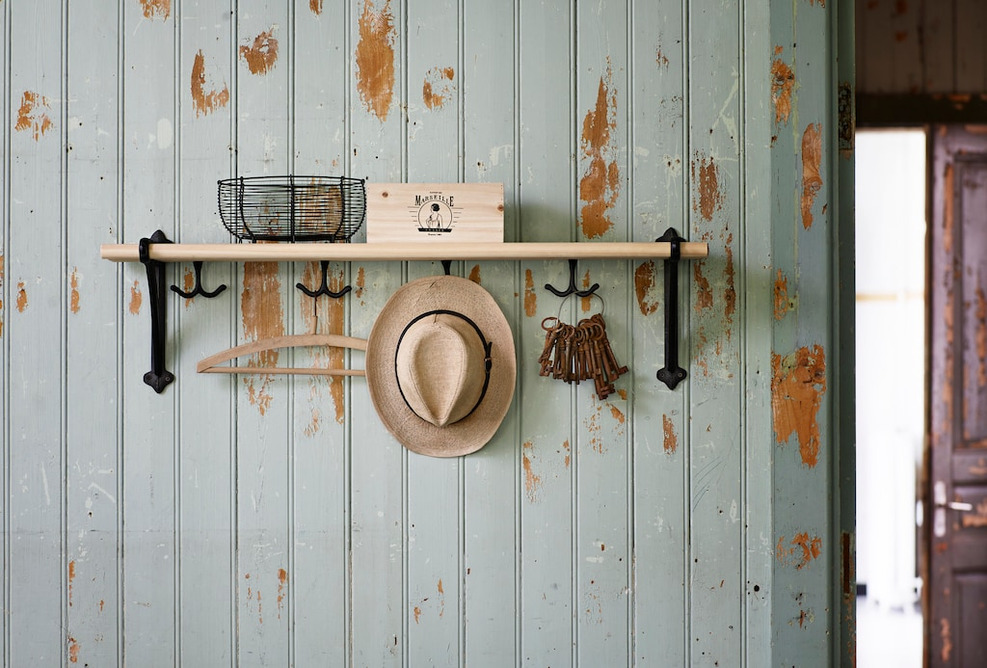 En tidlös hatthylla som kombinerar naturträ med robusta konsoler i svart gjutjärn. Läs mer
