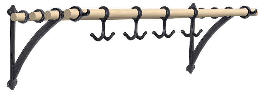 En tidlös hatthylla som kombinerar naturträ med robusta konsoler i svart gjutjärn. Med flera krokar och en stadig stång får du gott om plats för jackor, hattar och accessoarer.
